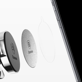Магнитен холдер за кола Baseus е съвместима с всички модели смартфони, независимо от размера на дисплея. Задната част е покрита с термополиуретан, който предпазва решетките на въздухоотвода от надраскване. В комплекта са включени две метални пластини и лепенки, за да адаптирате стойката според вашите нужди. Магнитите не влияят на работата на телефона, което я прави безопасна и надеждна